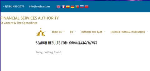 Даже при попытке найти жуликов Коин Менеджементс на сайте регулятора, на территории действия которого мошенники CoinManagements зарегистрировались, наши попытки не увенчались успехом. На изображении ниже вы можете увидеть результаты поиска шулеров Коин Менеджментс на сайте регулятора.