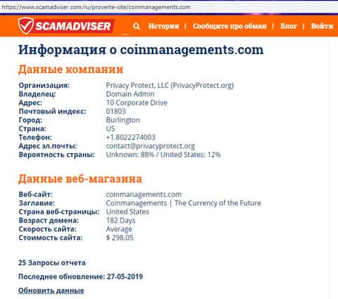 В связи с мошеннической и противозаконной деятельностью жуликов Коин Менеджментс уже в течении более полугода, руководители мошенников CoinManagements предпочитают анонимность дабы избежать ответственности. Информацию же о самом сайте лохотрона Коин Менеджментс вы можете увидеть на изображении ниже.