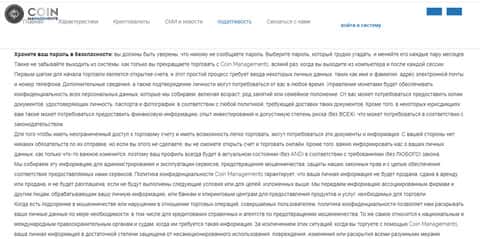 Далее в политике конфиденциальности аферистов CoinManagements следует очередная "вода", из которой состоит вся политика мошенников Коин Менеджментс, о том что клиентам необходимо сохранять конфиденциальность своего пароля и учетных данных, соответственно аферисты всю ответственность возлагают на клиентов.