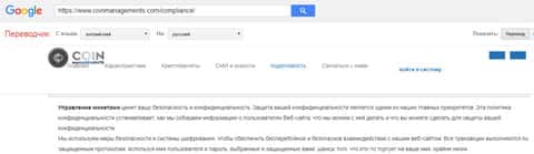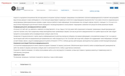 В общем по политике конфиденциальности проходимцев CoinManagements можно подвести итог о том, что шулера Коин Менеджментс не публикуют здесь ничего конкретного, а соответственно не стоит надеяться на реальную защиту вашей личной и персональной информации аферистами CoinManagements.
