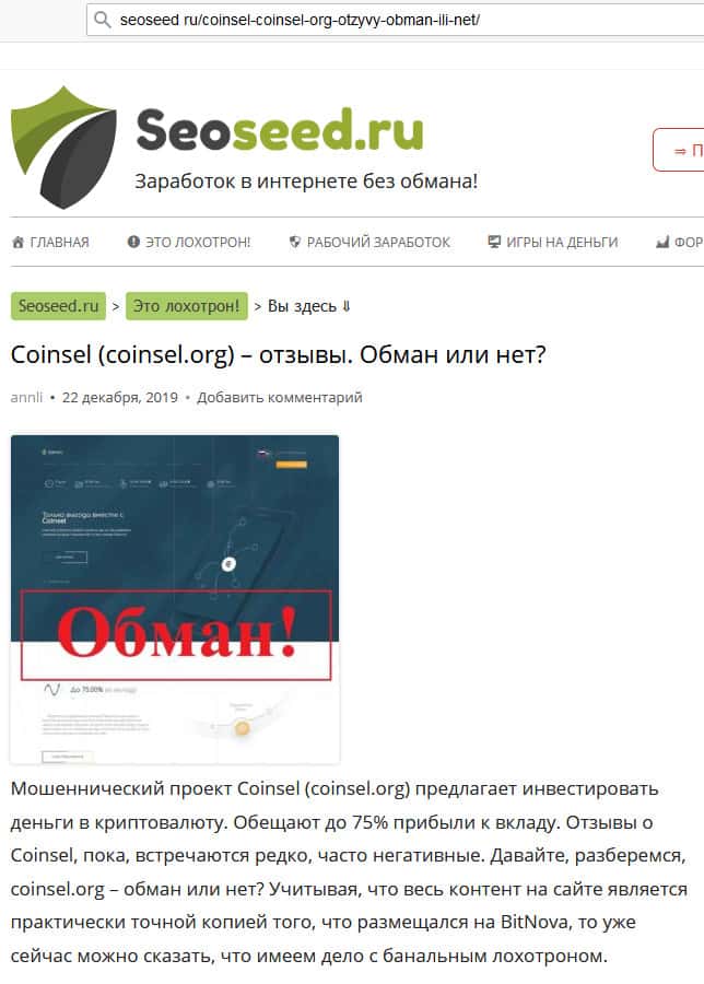 Любой авторитетный источник, который не продается за деньги, прямо говорит о том, что Коин Сел - это обычная шарага и лохотрон, где вас только разведут на деньги и ничего более. Стоило только нормально пройтись по таким сайтам и результат мог бы быть совсем другим. Не теряли бы люди так деньги. Так что дело не только в самих мошенниках.
