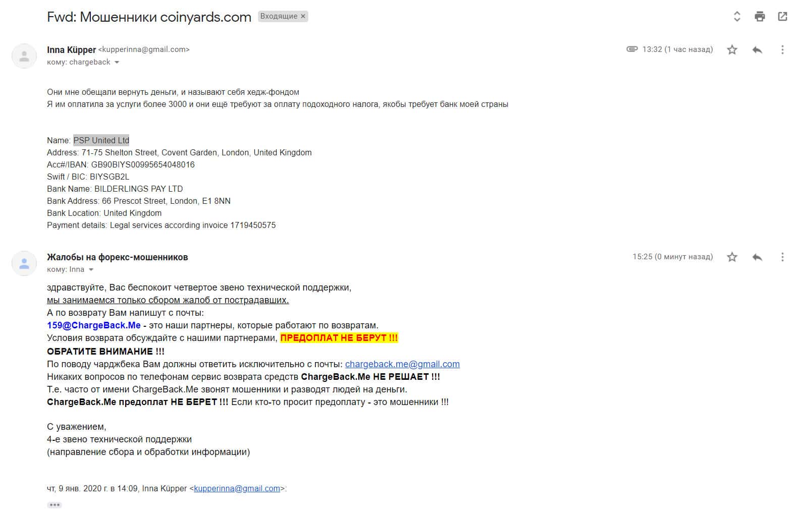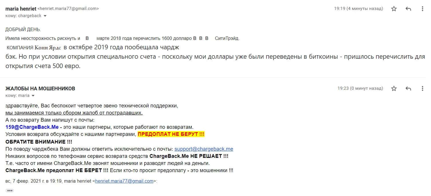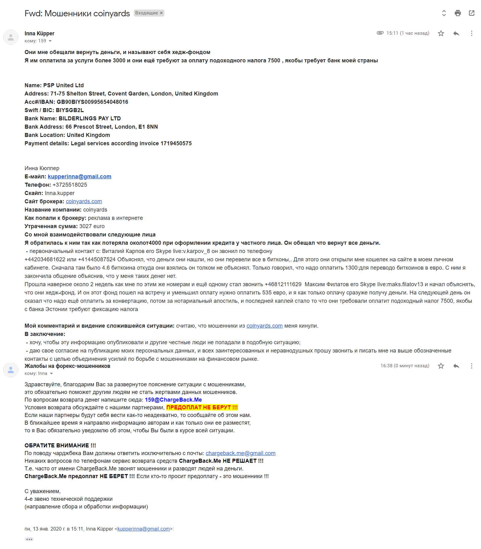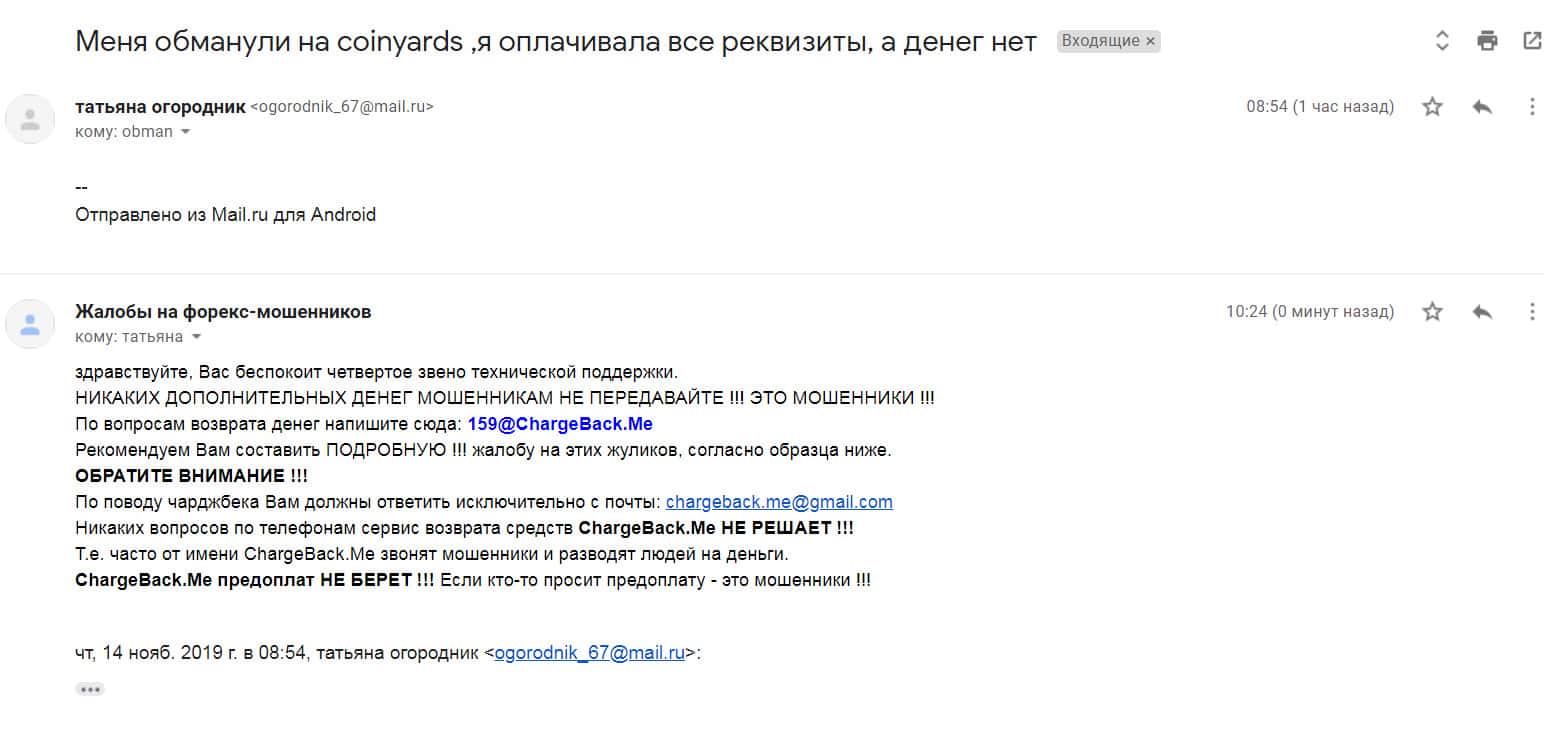 Еще одного человека обманула брокерская контора Коин Ярдс. Девушка утверждает, что мошенники написали ей на почту, и уверяя в том, что она получит горы золота, заставили вложить средства в их сайт. Всё шло хорошо, но, когда жертва заговорила о выводе, аферисты сразу же скрылись, и перестали выходить на связь с пострадавшей.