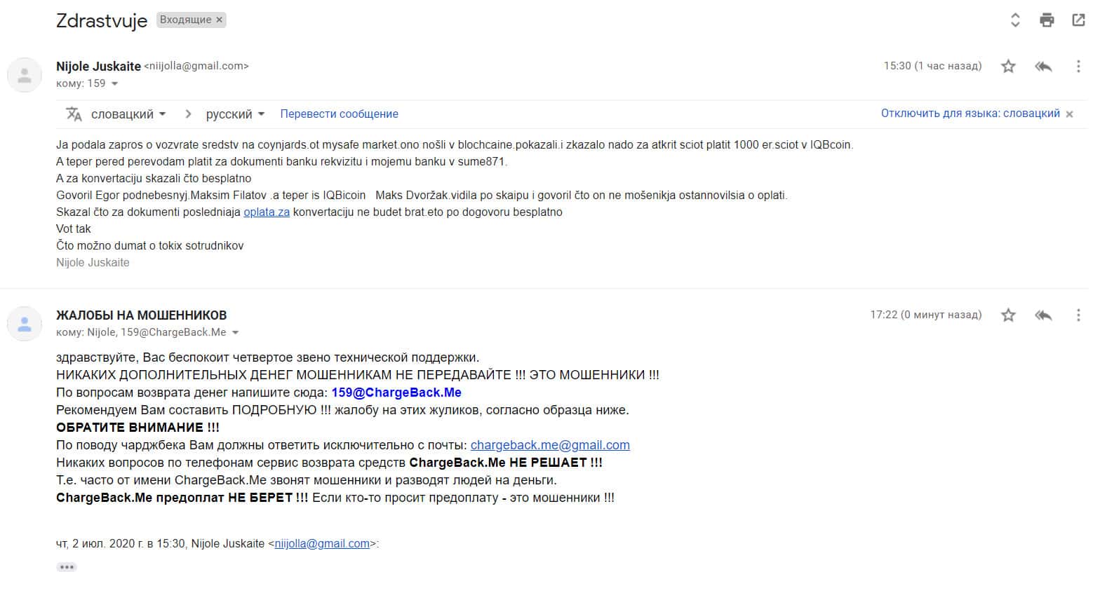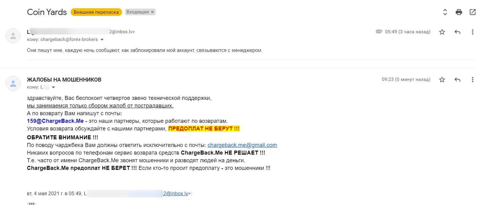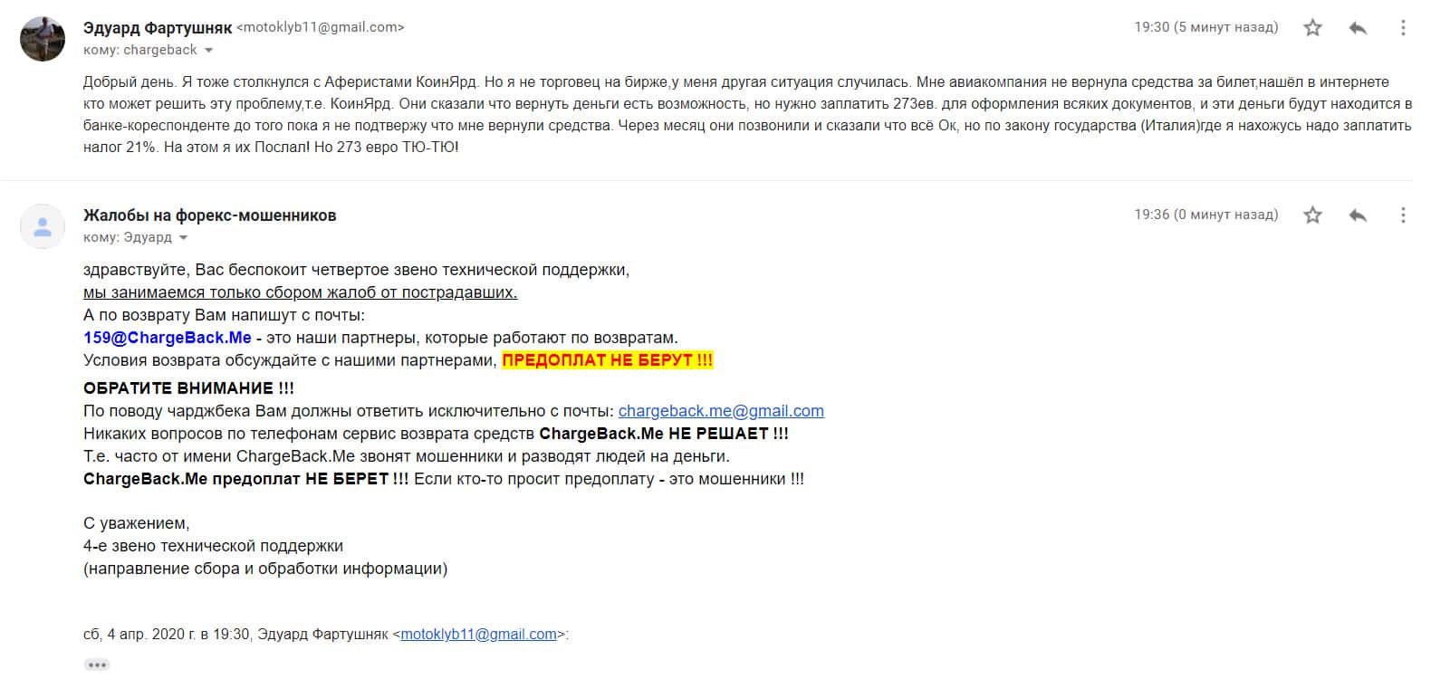 Еще одного человека обманула брокерская контора Коин Ярдс. Девушка утверждает, что мошенники написали ей на почту, и уверяя в том, что она получит горы золота, заставили вложить средства в их сайт. Всё шло хорошо, но, когда жертва заговорила о выводе, аферисты сразу же скрылись, и перестали выходить на связь с пострадавшей.