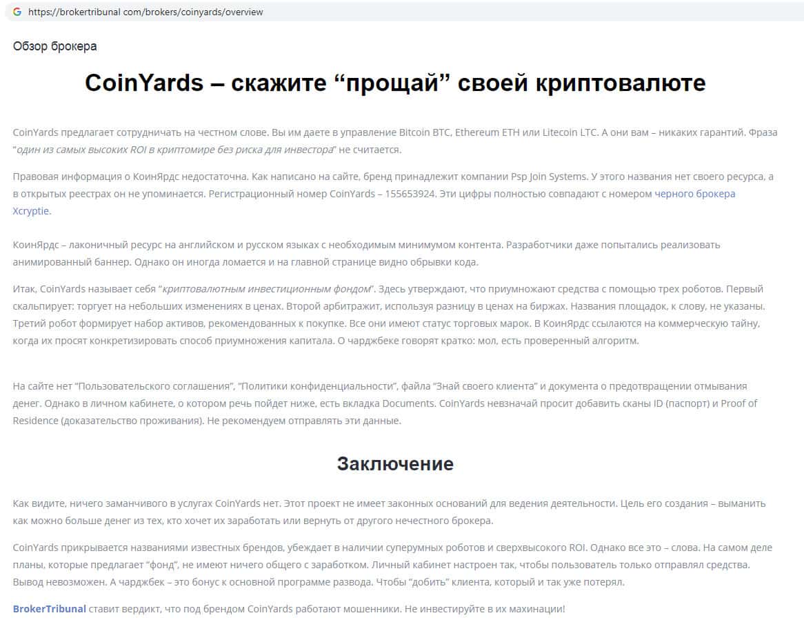 Статья-обзор об аферистах Коин Ярдс найдена на информационном сайте brokertribunal com