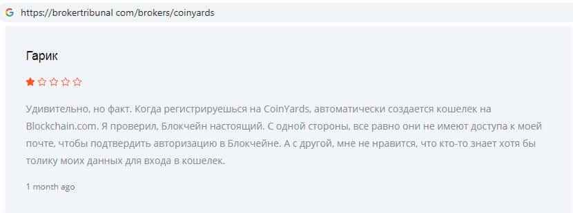 На информационном сайте brokertribunal com был найден отзыв Некого Гарика, свидетельствующий о том, что мошенники из Коин Ярдс непонятно откуда знают о данных на криптовалютном кошельке, которые на самом деле должны быть анонимными. Из этого следует вывод о том, что конторе CoinYards доверять не стоит.