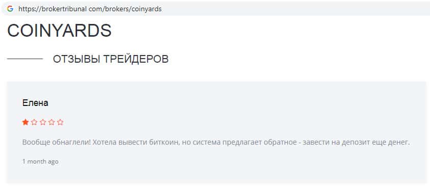 Отзыв некой Елены о шуллерах конторы CoinYards найден на веб-сайте brokertribunal com
