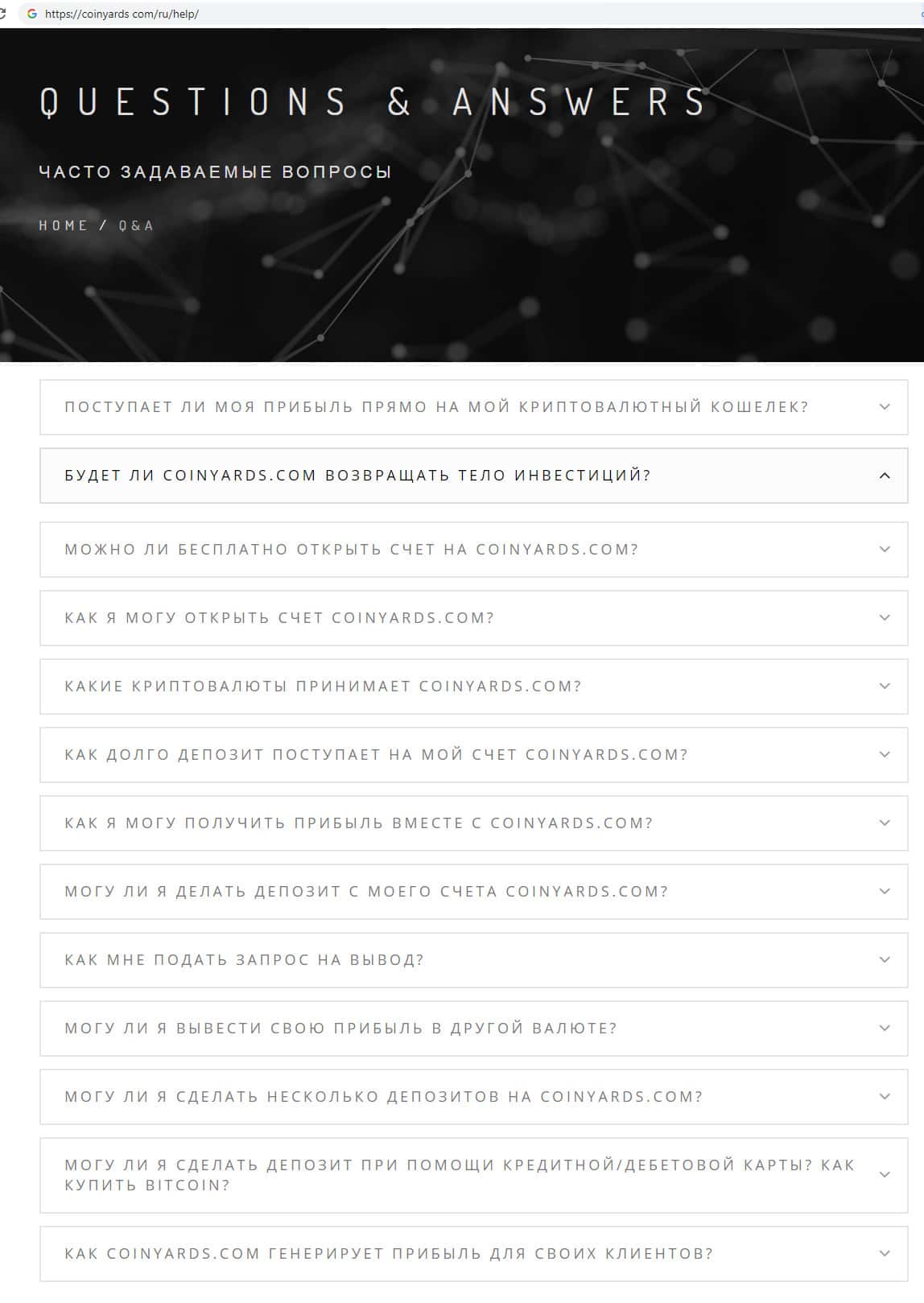 Жулики компании CoinYards на своем официальном сайте разместили вопросы и ответы для того, чтобы в случае возникновения каких-либо вопросов у клиента, ссылаться на уже хорошо продуманные ответы. Таким образом шуллера организации Коин Ярдс снимают с себя какую-либо ответственность за возникновение непредвиденной ситуации.
