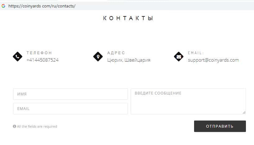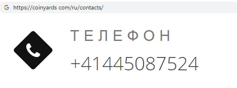Если верить предлагаемой информации на сайте мошенников, главный офис скам-конторы Коин Ярдс находится в Швейцарии. Из контактной информации шуллера скам-конторы CoinYards оставили номер телефона своей организации, а так же адрес электронной почты компании, которые указанны ниже: