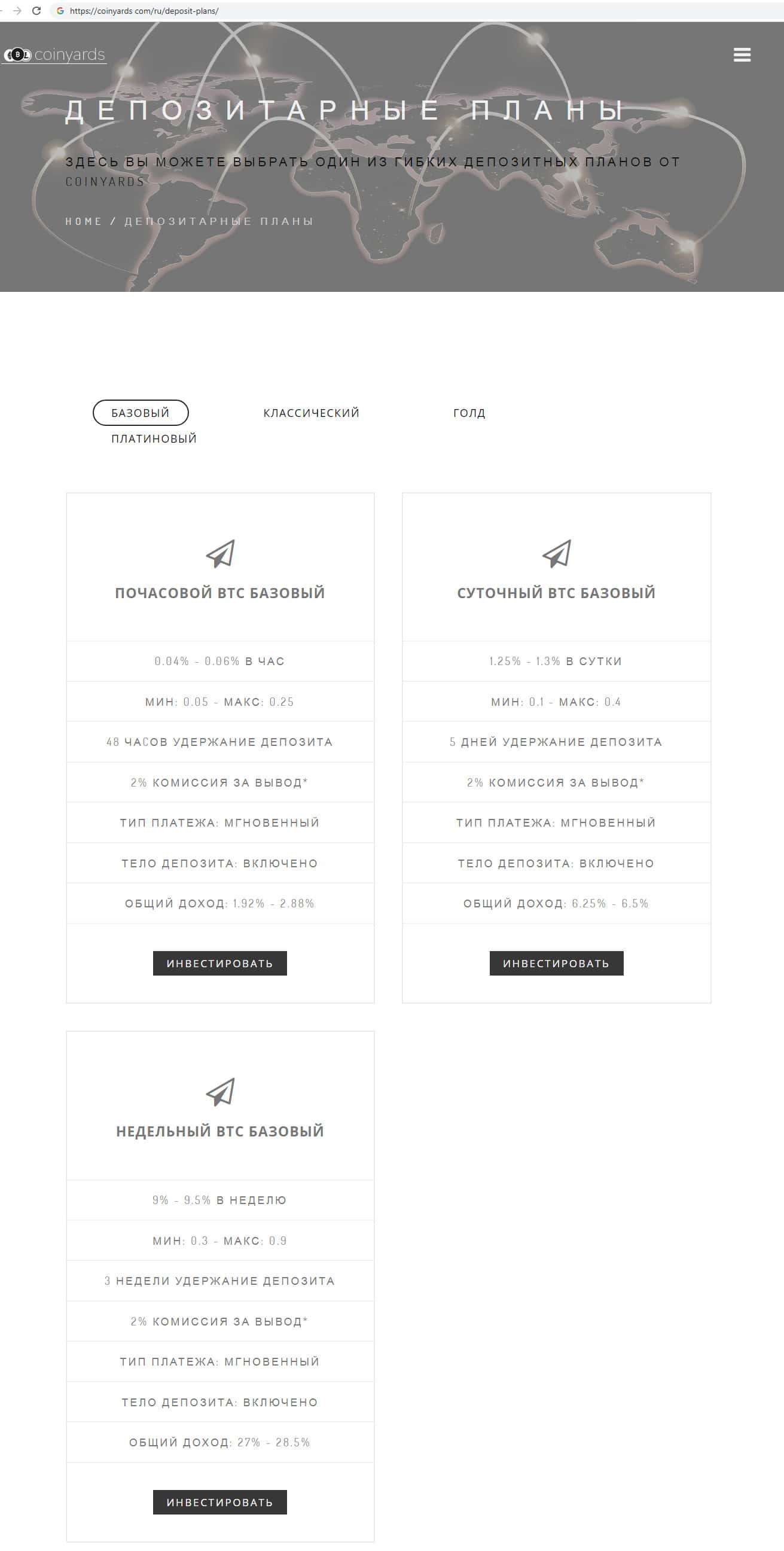 Мошенники организации CoinYards создают иллюзию того, что клиент может выбрать любой депозитный план в зависимости от суммы для инвестирования. На самом деле какой бы пакет услуг Вы не выбрали, вложенные денежные средства не будут Вам обратно возвращены, поскольку контора Коин Ярдс липовая и доверять им не стоит.