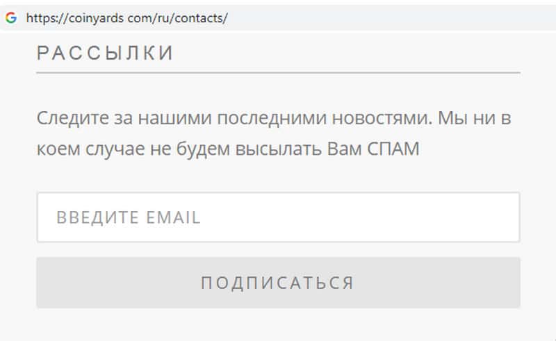 Жулики скам-конторы Коин Ярдс предлагают пользователям подписаться на рассылки новостей компании