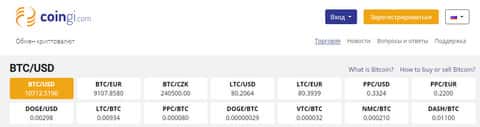 Начинается сайт у лохотрона Coingi с довольно не типичной шапки сайта, в которой у аферистов Коинги содержаться курсы обмена. Вероятней всего у жуликов Coingi просто не было желания добавлять что-то интересное в шапку своего сайта, поэтому они обошлись так. На изображении, расположенном ниже, вы можете увидеть шапку сайта жуликов Коинги.