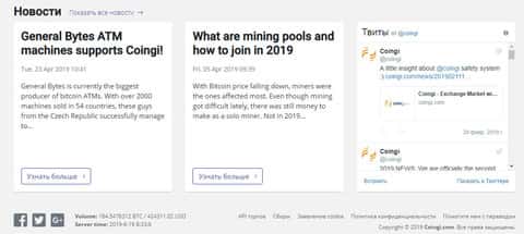 Завершается сайт у мошенников Коинги довольно кратко, а именно блоком новостей и ссылками на другие разделы сайта шулеров Coingi, и ссылками на страницы лохотрона Коинги в различных социальных сетях. На изображении, расположенном ниже, вы можете наглядно увидеть подвальное окончание сайта лохотрона Coingi.