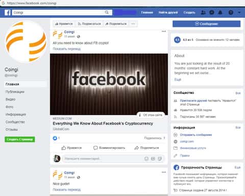 Дабы соответствовать всем современным трендам лохотрон Коинги решил обзавестись страницами в социальных сетях, одной из которых стал Facebook. В данной группе у аферистов Coingi в наглую накручено в районе 30 тысяч подписчиков, а вот активности на ней нету, что и говорит о накрутке подписчиков, что вы можете увидеть на изображении ниже.