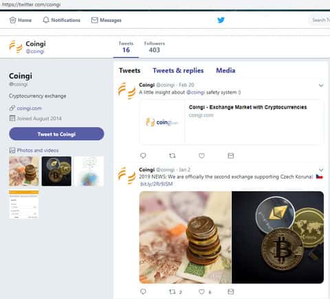 Присутствует у шулеров Coingi и страница в социальной сети Твиттер, которая имеет несколько сотен подписчиков, а посты публикуются раз в пол года, что говорит о явном безразличии аферистов Коинги к данной социальной сети. На изображении, расположенном ниже, вы можете увидеть внешний вид страницы лохотрона Coingi в социальной сети Twitter.