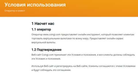 Начинаются условия лохотрона Coingi с информации о том, что клиент соглашается со всем условиями и документами аферистов Коинги фактом своей регистрации или использования сайта мошенников Coingi. На изображении, расположенном ниже, вы можете наглядно увидеть начальные условия клиентского соглашения аферистов Коинги.
