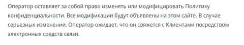 Завершается политика конфиденциальности у мошенников Коинги довольно ожидаемо, а именно информацией о том, что аферисты Coingi могут в любой момент по своему усмотрению изменить данную политику конфиденциальности по своему личному усмотрению. На изображении, расположенном ниже, вы можете увидеть окончание политики конфиденциальности лохотрона Коинги.