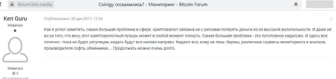 Люди намного охотней поверят придуманным историям, чем рискнут столкутся с реальностью, которая на деле не такая радужная, как её представляют кидалы Coinigy и им подобные. А реальность такова, что реальные отзывы, например, о мобильном приложении Коиниджи, подтверждают наши слова, что дальше сладких баек сие мошенники не пошли.