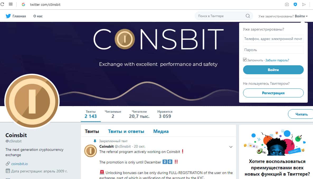 - страничка в Твиттер twitter com/c0insbit