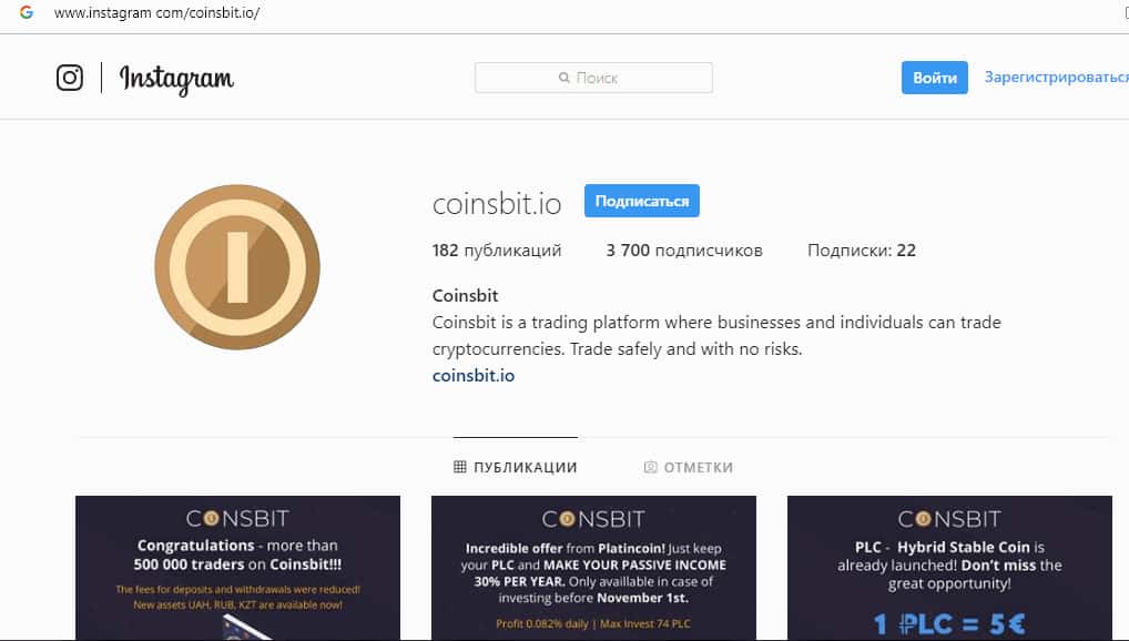 - аккаунт в Инстаграм instagram com/coinsbit.io