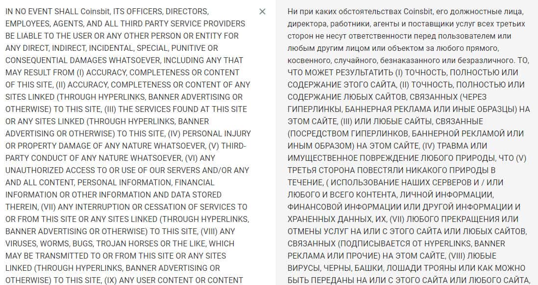 Чтобы полностью понять брокерскую контору Коинс Бит, а именно то о чем пишут в договоре, следует обратиться в раздел Ограничение ответственности. Там сказано, что криптовалютная биржа Коинс Бит ни при каких обстоятельствах не несет ответственность перед клиентом за его убытки, который он получит по вине той же конторы.