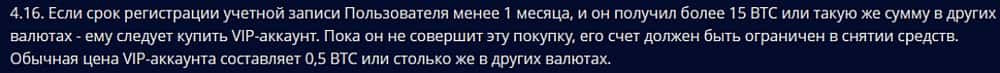 Есть некий VIP-счет, который обязателен для покупки при выполнении некоторых условий торговли. Вывод средств до его приобретения блокируется, а разблокировка стоит 0,5 BTC!