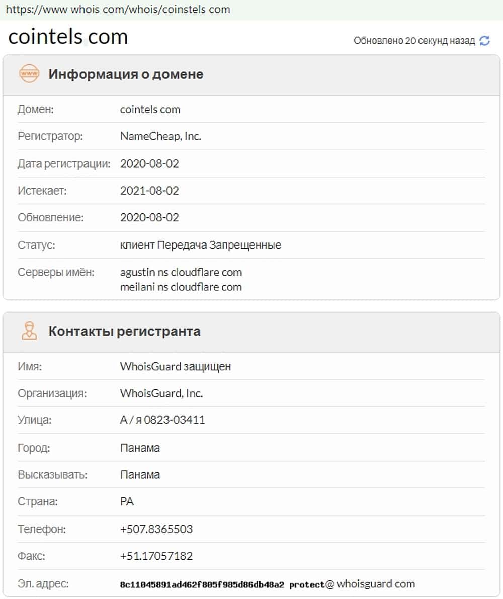 Владелец доменного имени, которое прикреплено к веб-болоту CoinsTels, предпочитает оставаться темной лошадкой для клиентов, поэтому скрыл свои данные сторонним сервисом.