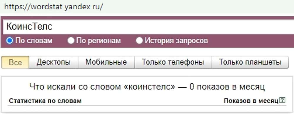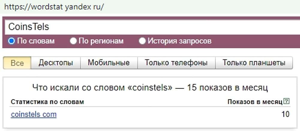 Запрос о лохотроне "КоинсТелс" тоже не востребован среди тех, кто предпочитает поиск Яндекс другим альтернативным подобным сервисам. Никто не желает связываться с жуликами.