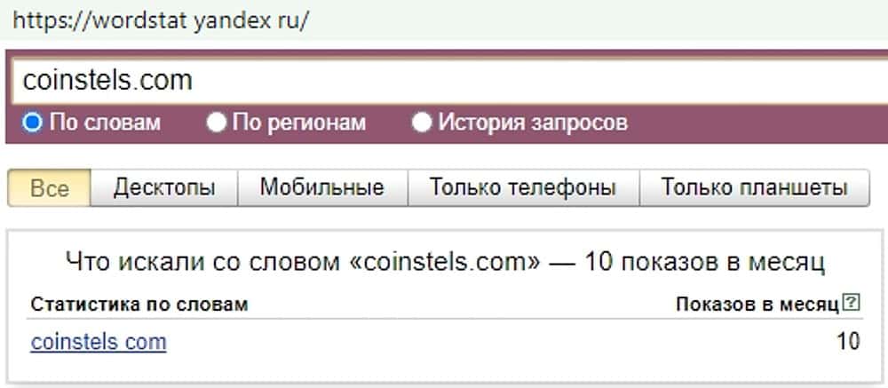 Доменное имя и сайт шарлатанстсва "coinstels.com" пользователи поискового сервиса Yandex Ru искали всего 10 раз за месяц. У проходимцев нет шансов завоевать эту аудиторию.