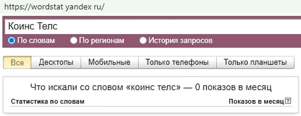 - Насколько популярна шайка плутов Коинс Телс у пользователей Яндекс?