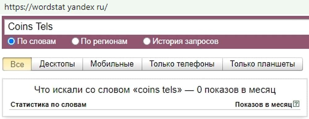 А вот запрос "Coins Tels" и вовсе не проскакивал в строке поисковой нейросети Yandex Ru, что говорит о крайней непопулярности этой пародии на криптовалютную биржу у населения.