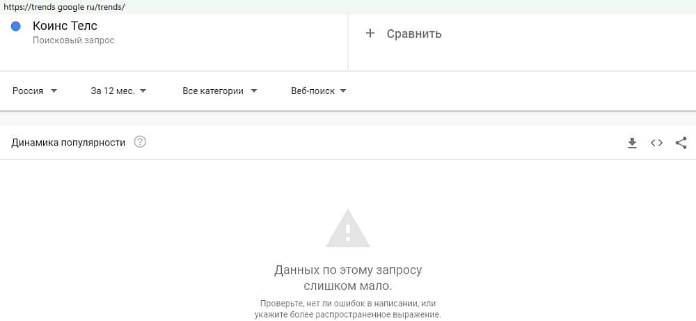 Русскоязычная вариация названия шарашки "Коинс Телс" также ни разу не попала в строку поиска сервиса Гугл, поэтому мошенники могут даже не надеяться отхватить часть аудитории.