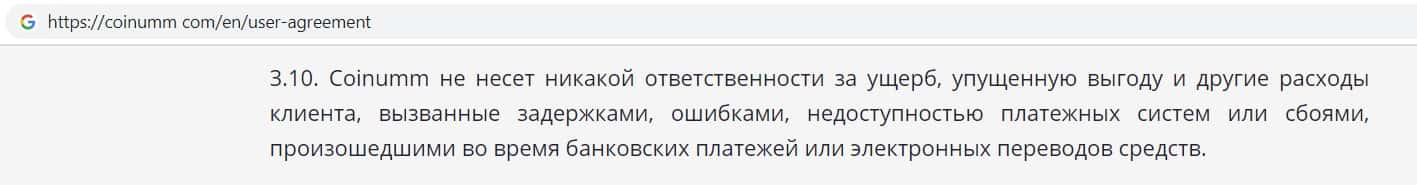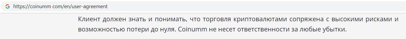 Мошенническая компания Коинумм так же внесла пункт в своё соглашение, в котором указала, что не несёт абсолютно никакой ответственности за все убытки своих клиентов.