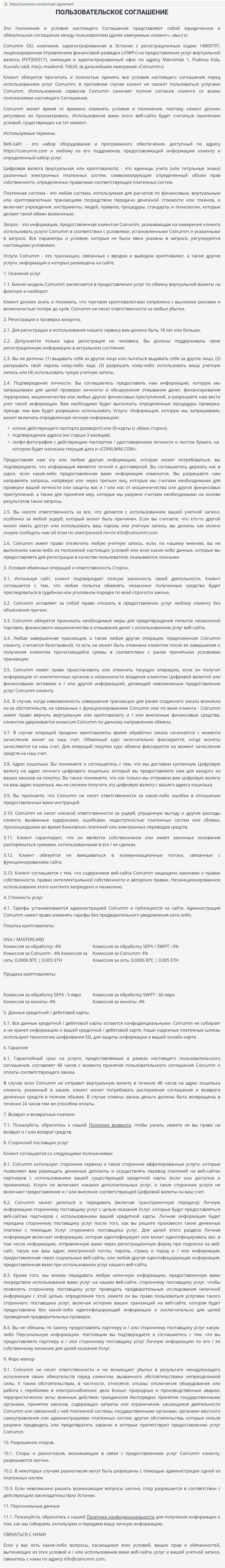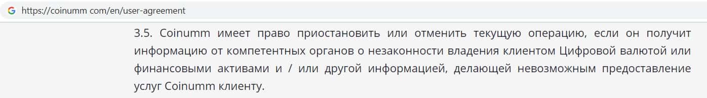 Компания жуликов Coinumm так же указала, что имеет право отказать клиенту в любой операции, если из компетентных источников узнает о незаконных действиях клиента.