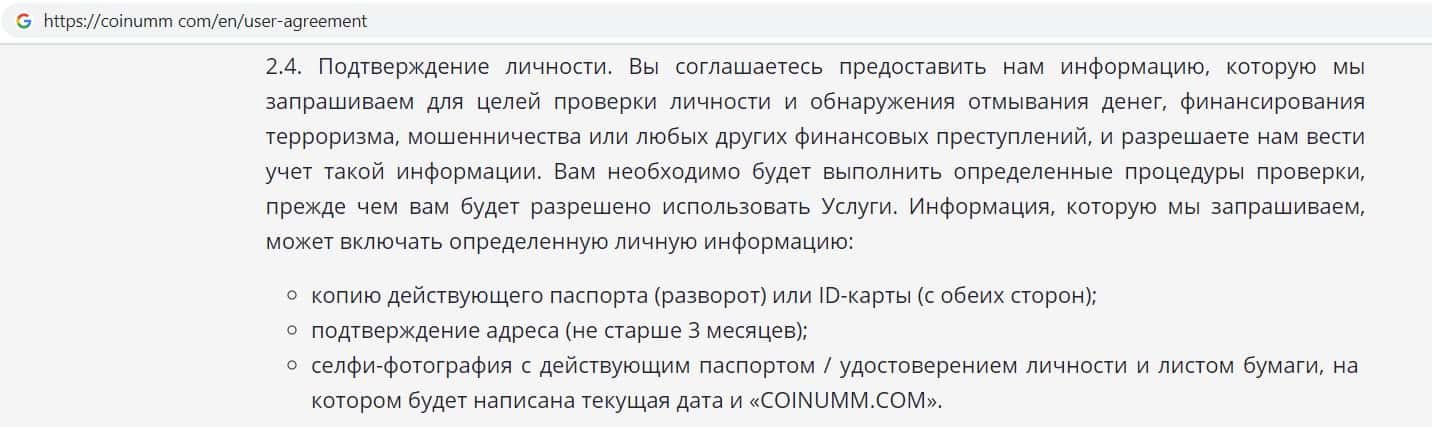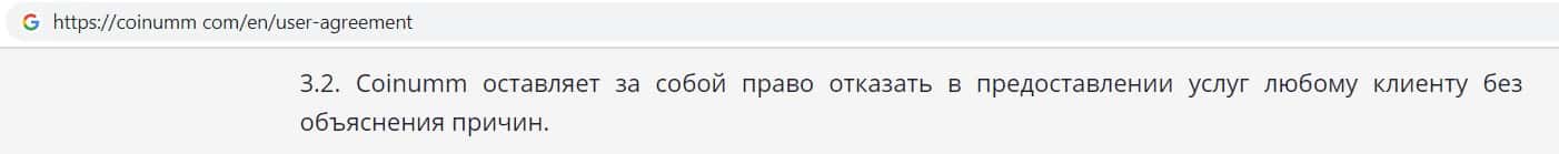 Так же компания Коинумм указала, что может отказать в предоставлению услуг любому пользователю, по своему усмотрению. Фирма выбирает клиентов с большим достатком.
