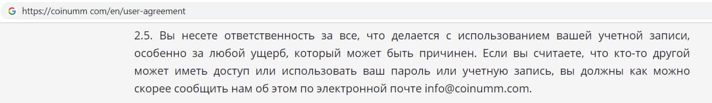 Так же контора кидал Коинумм представила пункт, в котором указала, что вся ответственность лежит на клиенте и он отвечает за все действия связанные с его аккаунтом.