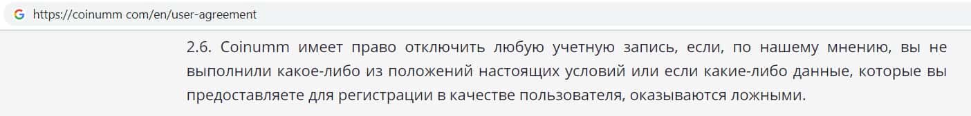 Лохотрон Коинумм в своём соглашении указал пункт, в котором идёт речь о том, что фирма жуликов имеет право заблокировать любого клиента, если посчитает, что он нарушил правила.