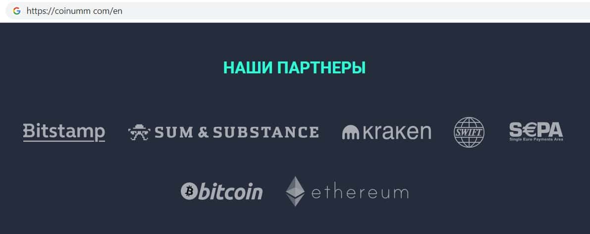 Фирма мошенников Коинумм на своём сайте указала информацию о своих партнёрах, которыми в свою очередь являются небезызвестные мошенники, такие как: Kraken и БитСтамп.
