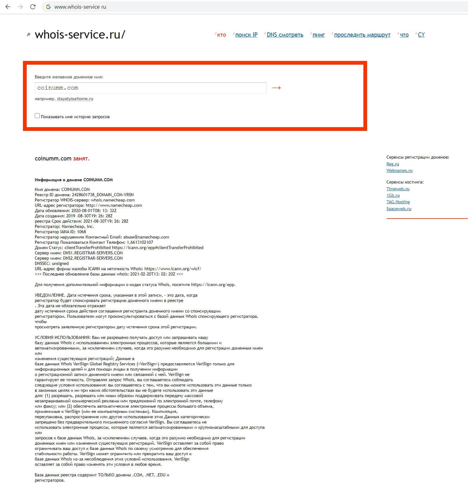 Мы использовали сайт whois-service ru для того, чтобы узнать владельца домена разводил Coinumm. Оказалось, что фирма скрывает мошенников данную информацию.