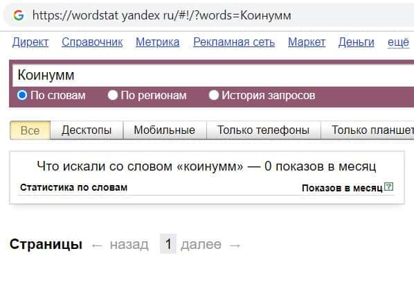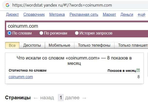 Далее мы проверили количество запросов фирмы аферистов Coinumm по русскоязычному названию компании, а именно "Коинумм", но данный запрос пользователи не выполняли.