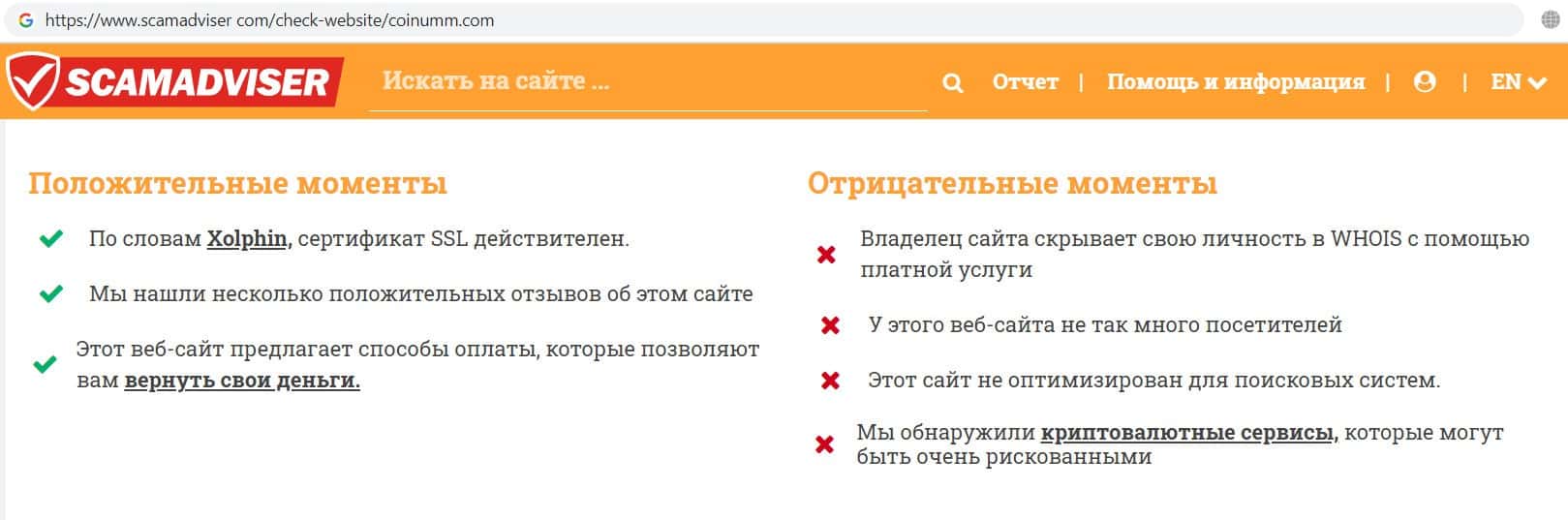 Мнение интернет ресурса scamadviser com о конторе махинаторов Coinumm