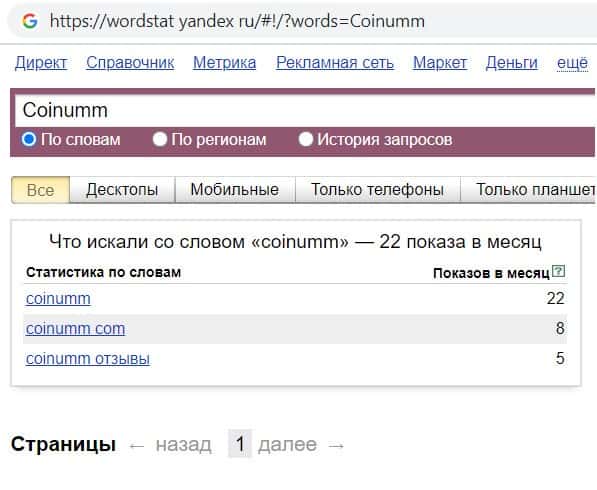 Мы проверили количество запросов компании мошенников Coinumm в Яндексе по названию фирмы, а именно "Coinumm". данный запрос пользователи выполнили 22 раза.