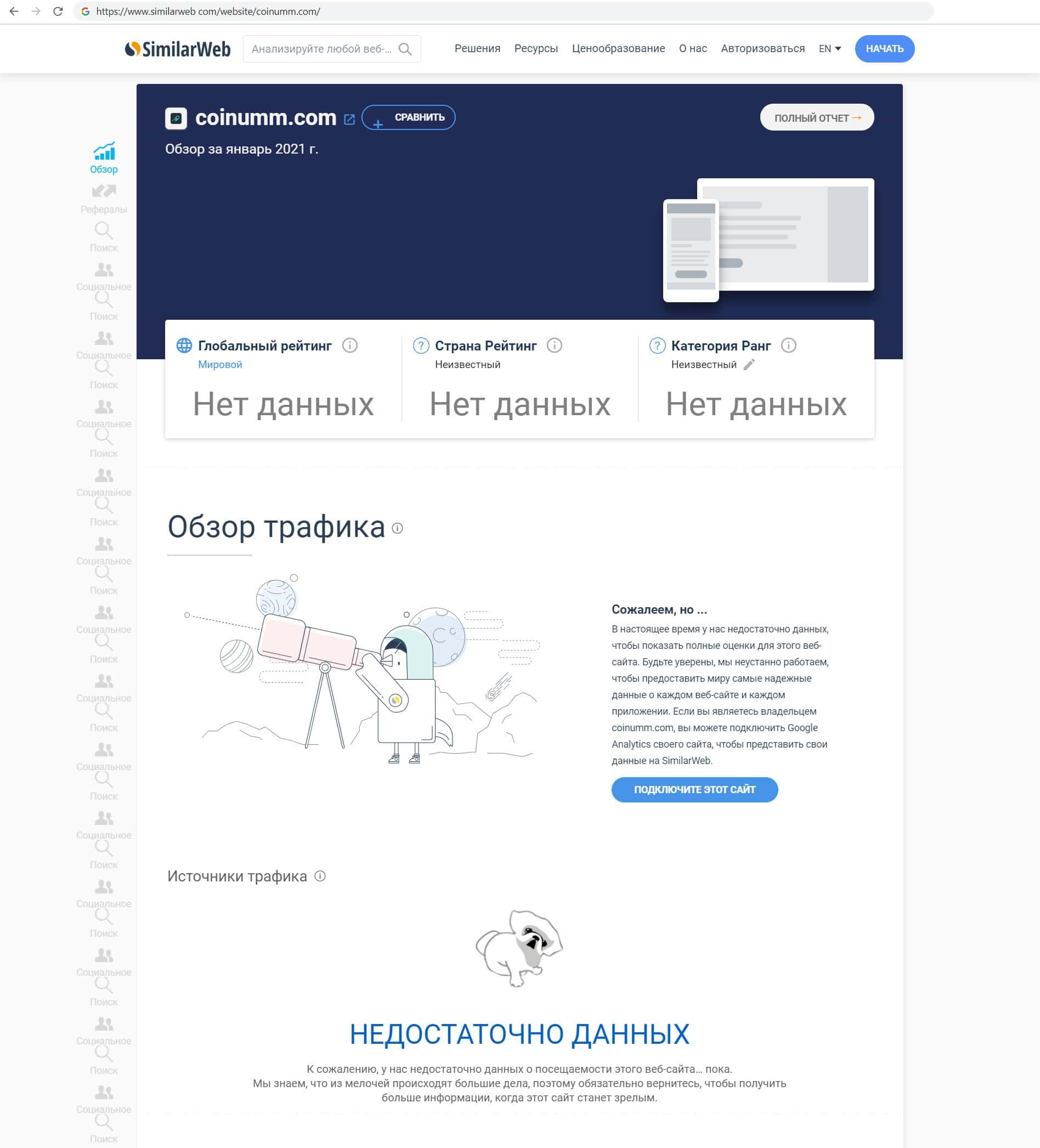 С помощью сайта similarweb com мы решили узнать трафик сайта аферистов Коинумм, но международный сервис не владеет информацией о данной организации.