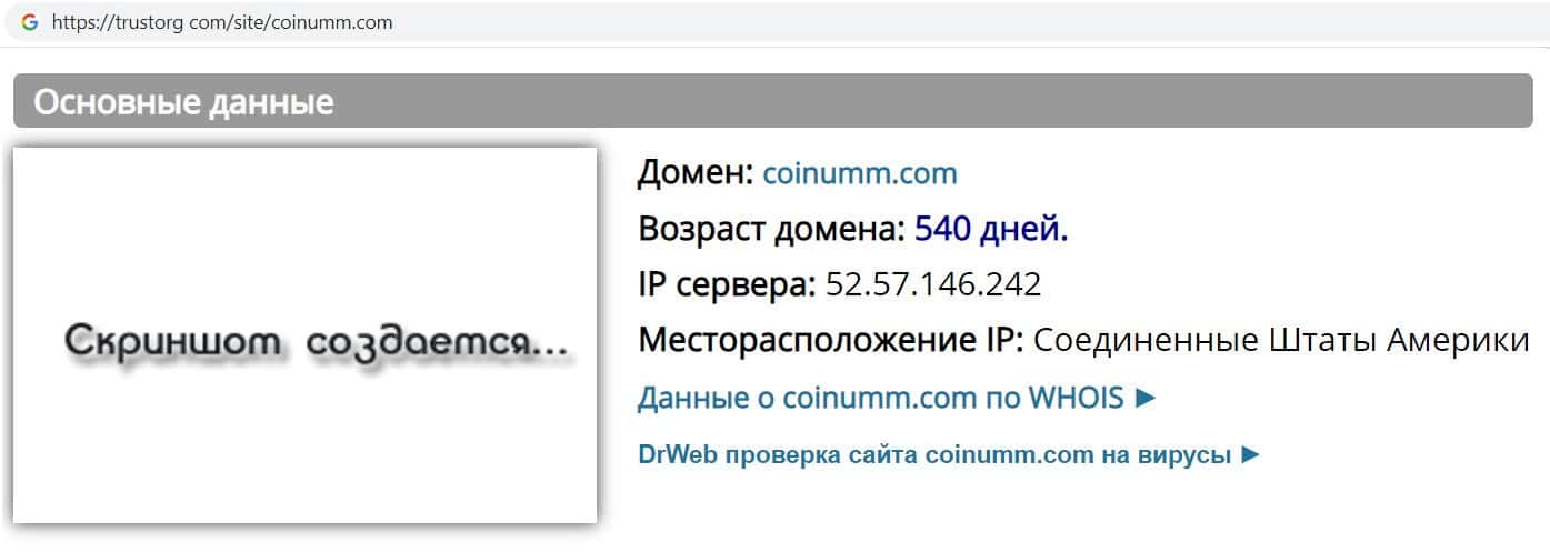 Мы решили узнать возраст главного сайта кидал Коинумм через интернет ресурс "Доверие в Сети". Оказалось, что мошеннический проект разводит клиентов уже почти два года.