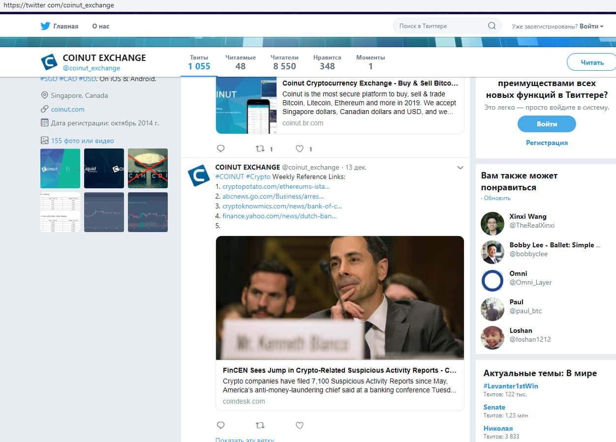 Имеется у аферистов Coinut и страница в социальной сети Twitter, где у шулеров Коинут размещена довольно стандартная и типичная лапша на уши наивной клиентуре и накручено около десяти тысяч подписчиков. На изображении, расположенном ниже, вы можете наглядно увидеть внешний вид страницы аферистов Коинут в социальной сети Твиттер.