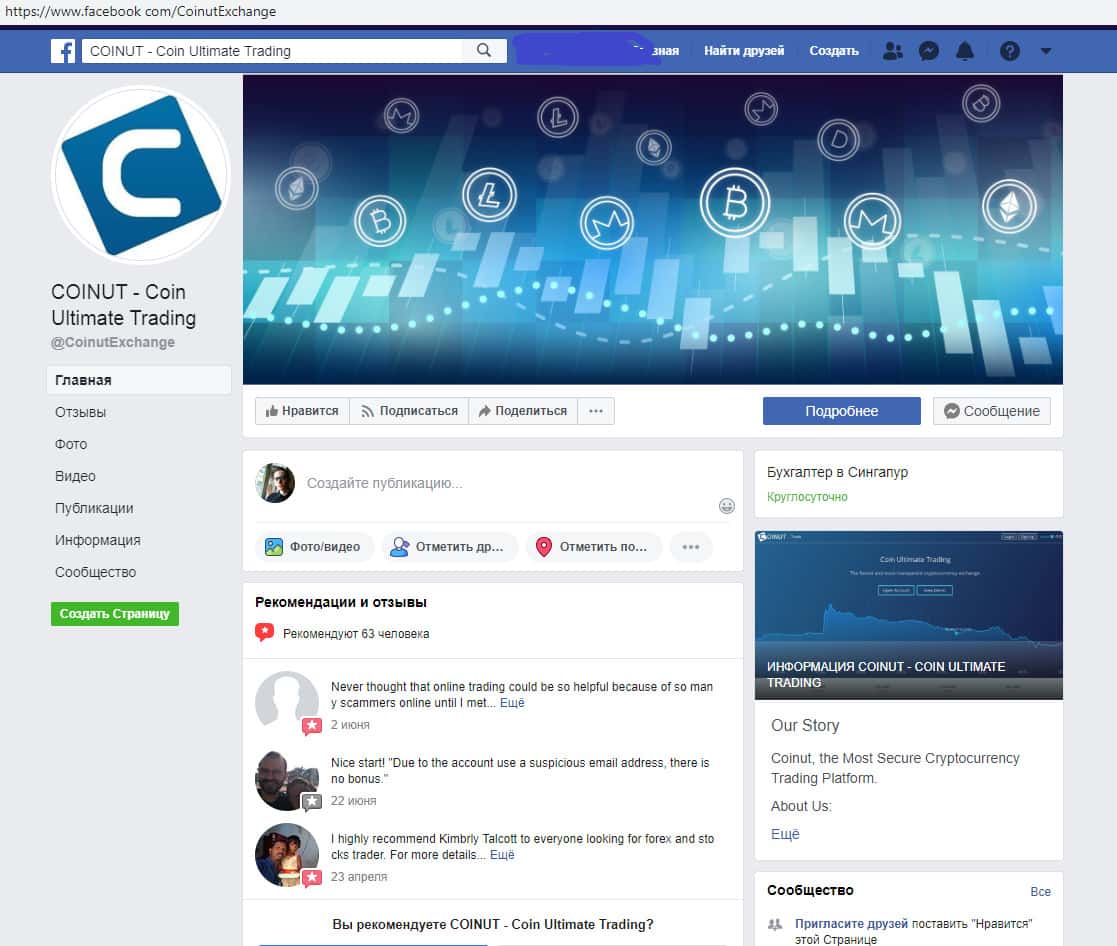 Дабы соответствовать современным трендам шулера Coinut обзавелись страницами в социальных сетях одной из которых является Facebook, где у мошенников Коинут имеется всего несколько тысяч подписчиков. На изображении, расположенном ниже, вы можете наглядно увидеть внешний вид страницы проходимцев Coinut в социальной сети Фейсбук.