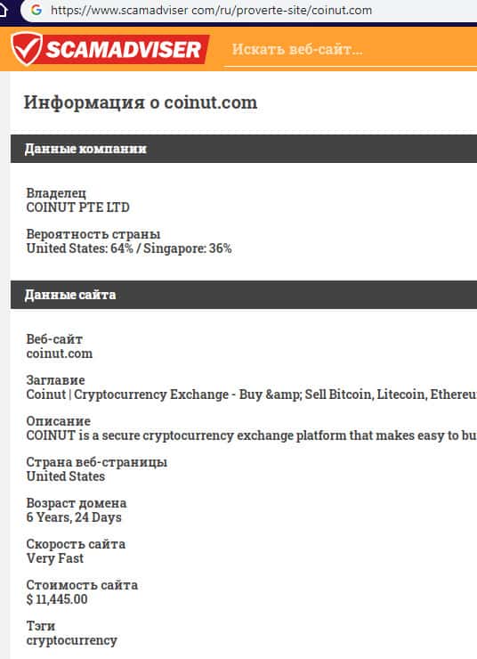 В связи с мошеннической и противозаконной деятельностью лохотрона Coinut его реальные руководители предпочитают анонимность дабы избежать ответственности со стороны правоохранительных органов. Техническую же информацию о сайте жулья Коинут можно узнать непосредственно с помощью портала scamadviser com, что вы можете увидеть ниже.