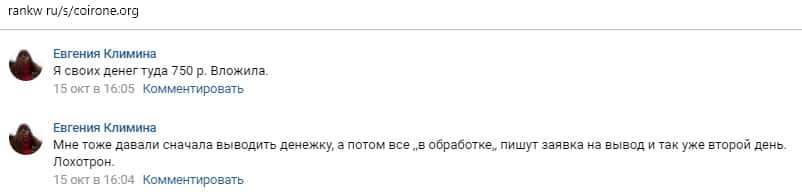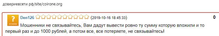 Еще один клиент конторы Coirone Org рассказывает, как он доверился менеджерам данного лохотрона и потерял там свыше 1000 рублей. По его словам аферисты дают выводить только небольшие суммы, а если начать выводить все деньги, то попросту все средства будут заблокированы навсегда.