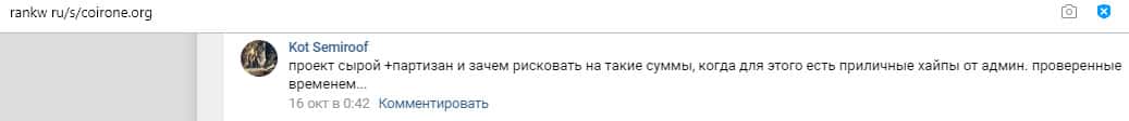 Очередной пользователь сети высказал свое мнение, касательно того, что Коирон - это довольно сырой проект, который провоцирует жадных и рисковых людей вкладывать большие суммы денег, дабы за короткий срок заработать огромные суммы денег. Нет смысла с ними связываться, иначе потеряете все.