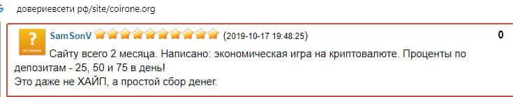 Один интернет-пользователь уточняет момент с конторой Коирон. Дело в том, что на сайте написано, что это экономическая игра, которая якобы выплачивает проценты по депозитам от 25 до 75% в день. По сути это даже для хайпа много, поэтому лохотрон Coirone Org создан для сбора средств с лопухов.