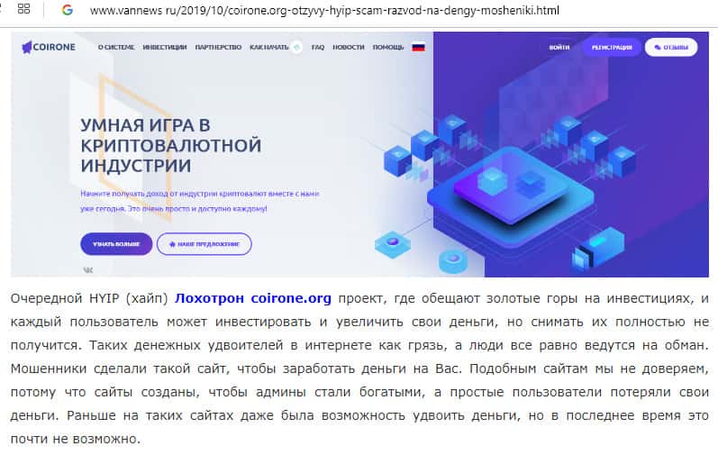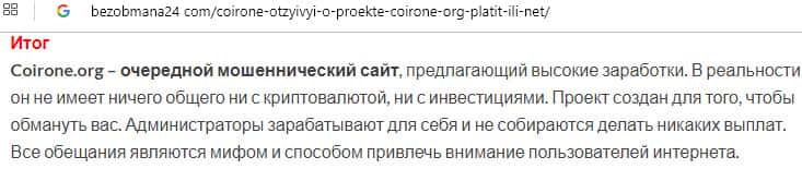 Еще один ресурс считает, что Коирон - это очередной мошеннический сайт, который предлагает высокие заработки за короткое время. На самом деле лох-проект не имеет ничего общего как с инвестициями, так и криптовалютой и является просто обычным лохотроном для сбора денег с наивных интернет-пользователей.